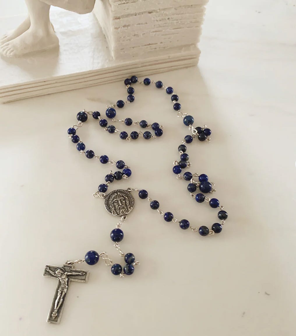 The semi-precious beads are stunning blue lapis, which has been called Our Lady's stone since the early Church. They come in 6mm for the Hail Mary beads, and 8mm for the Our Fathers.